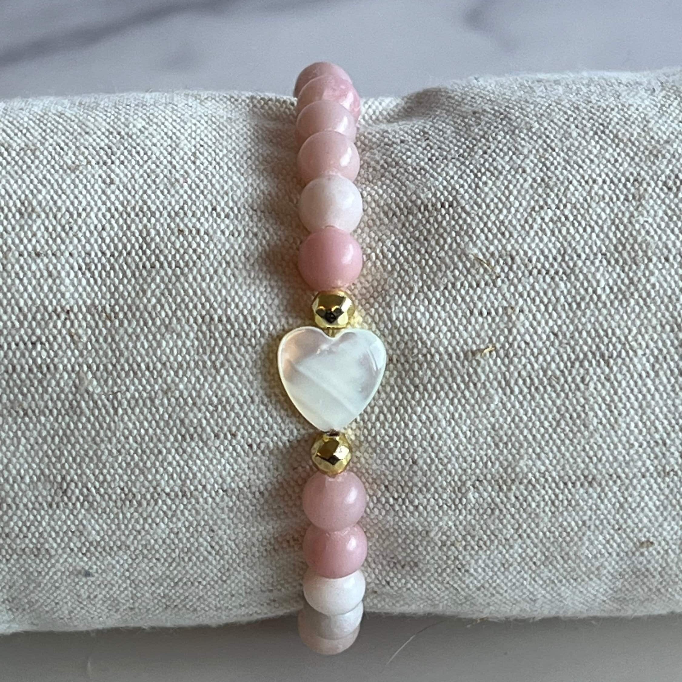 Pink Opal 6mm Beaded Bracelet with Mother of Pearl Shell Bead and Gold Hematite Spacer Beads