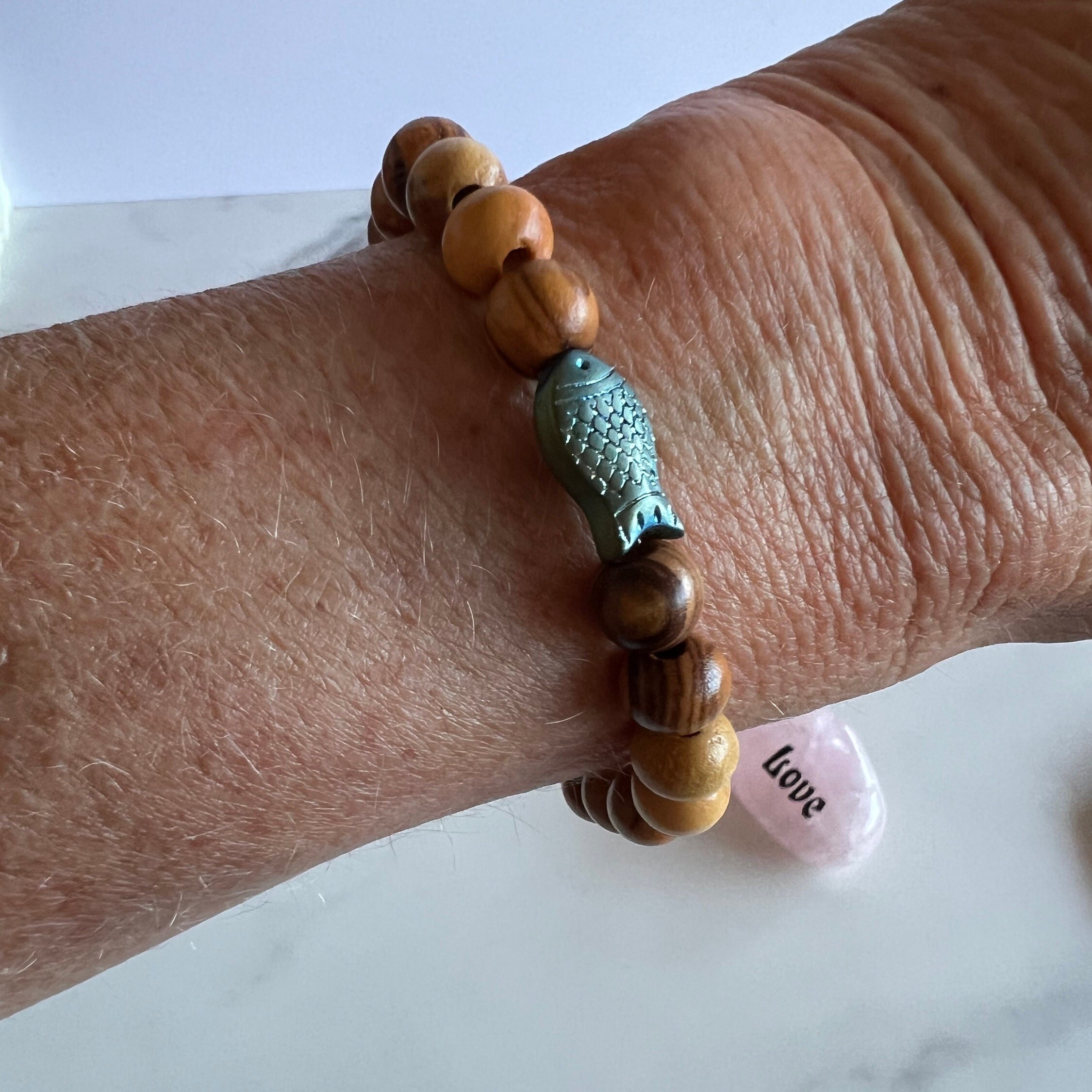 6mm Beads from the Holy Land. Authentic Olive Wood beads from Bethlehem along with blue colored fish focal bead which makes for a beautiful and meaningful elastic bracelet.