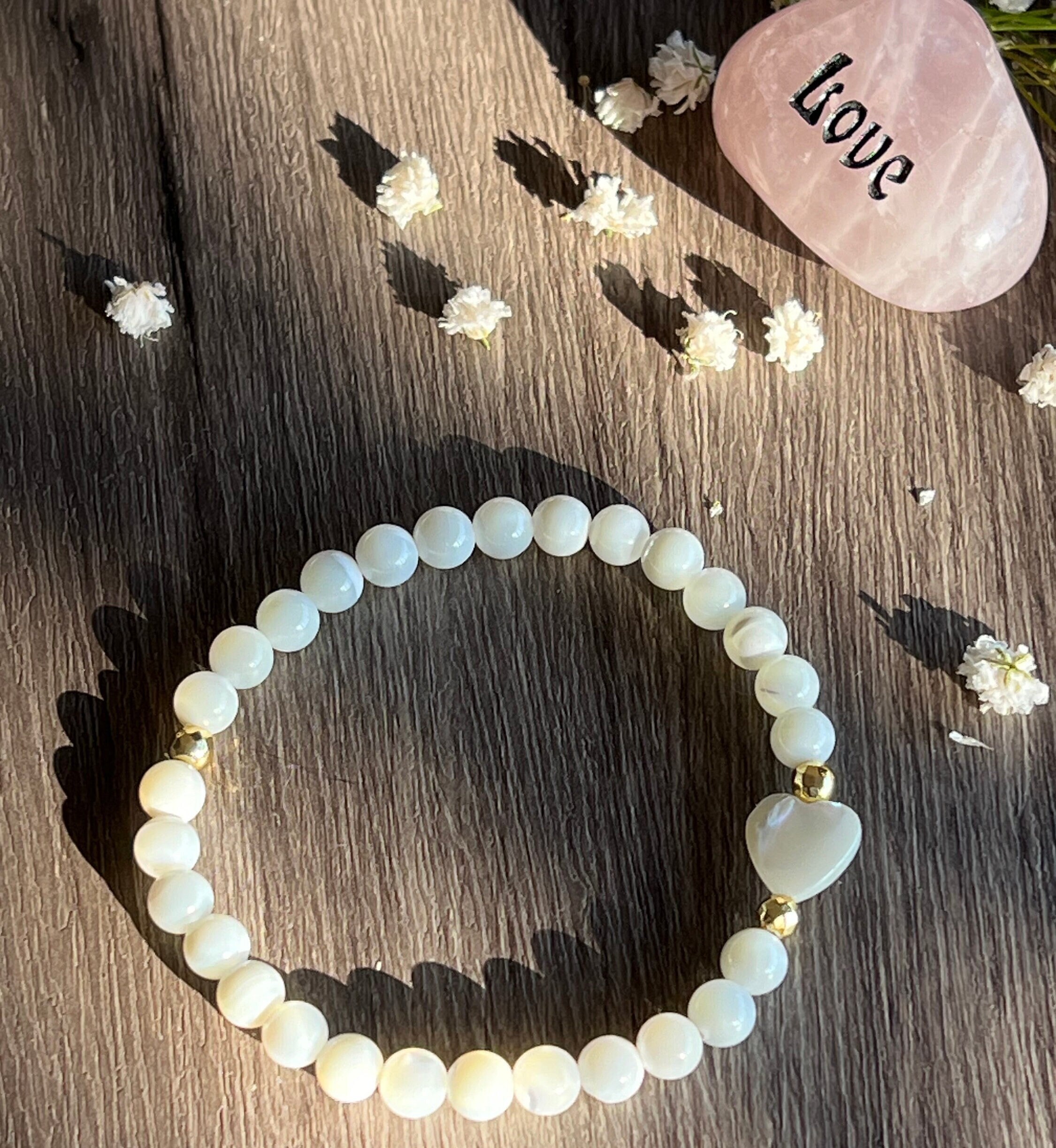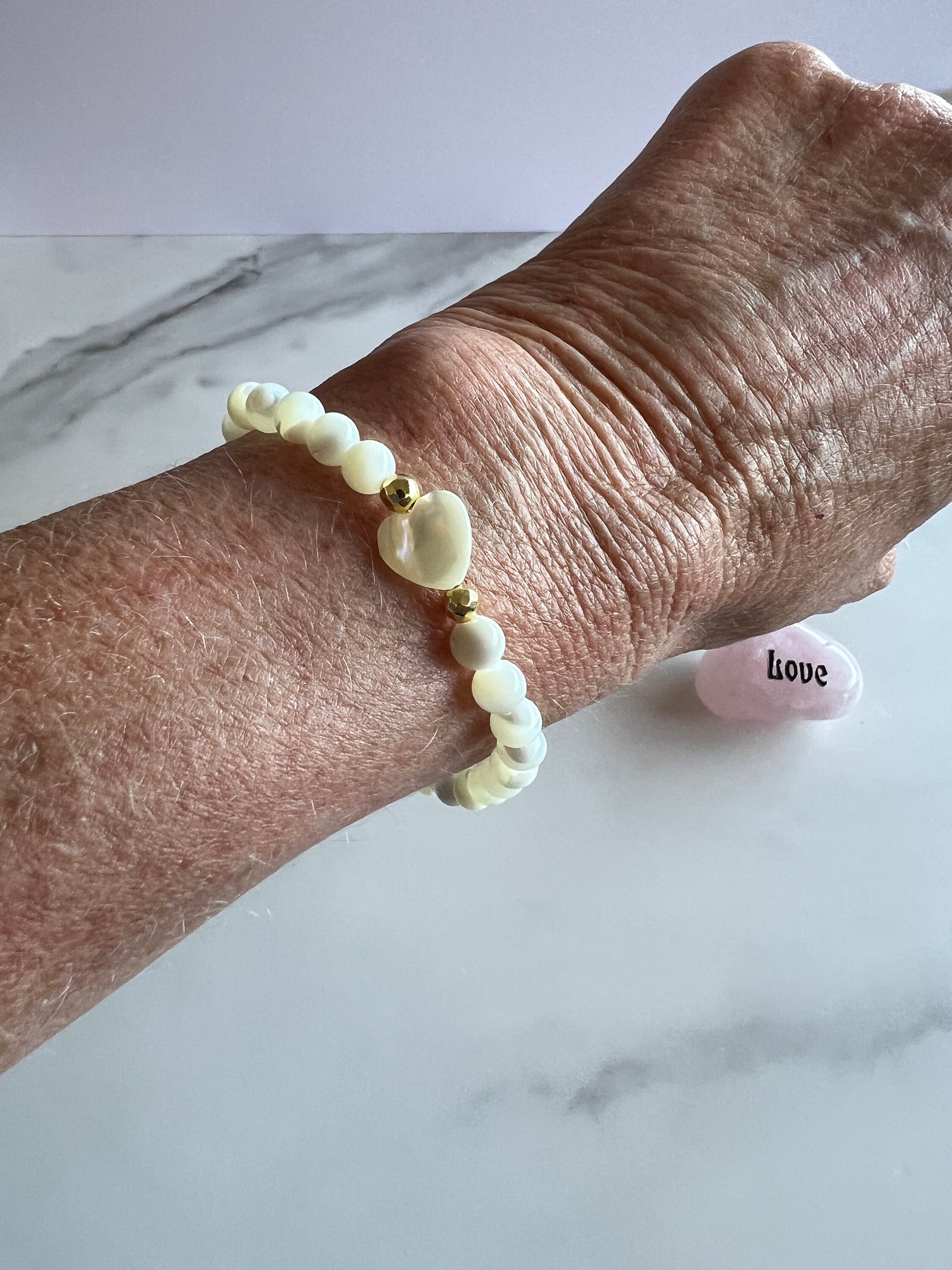 6mm Freshwater Mother of Peal Beaded Bracelet with MOP Heart Focal Bead and Gold Hematite Spacer Beads