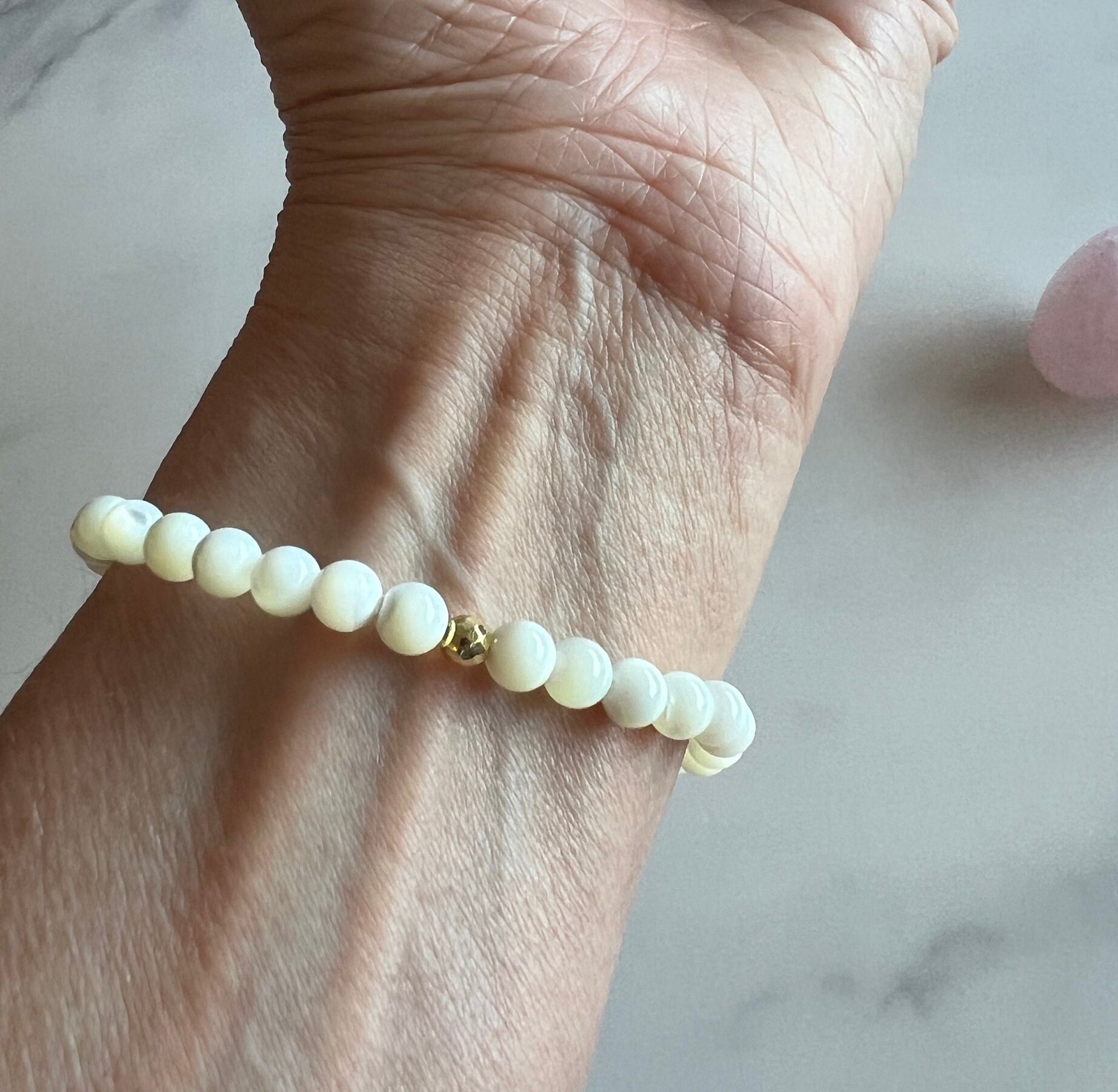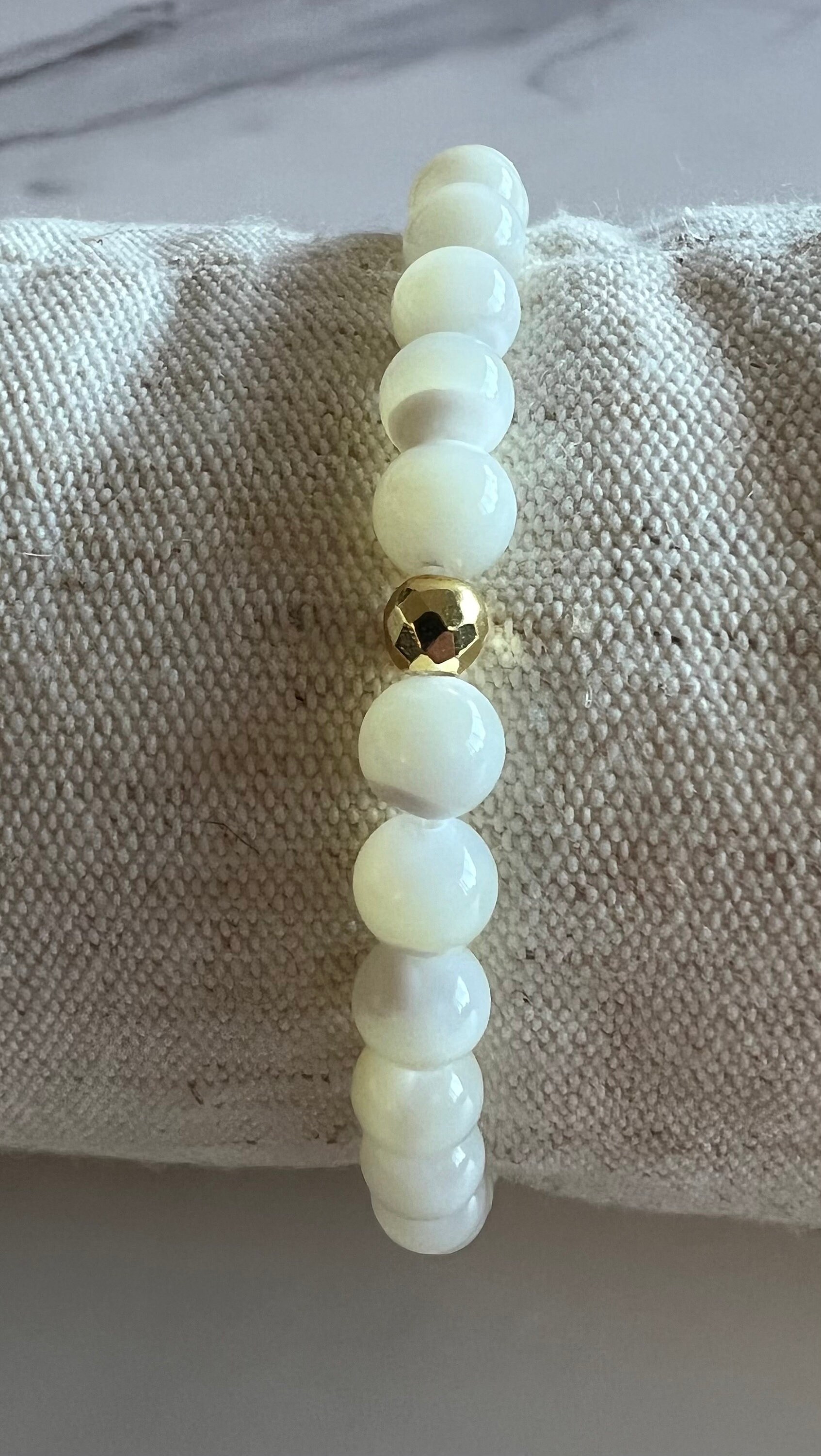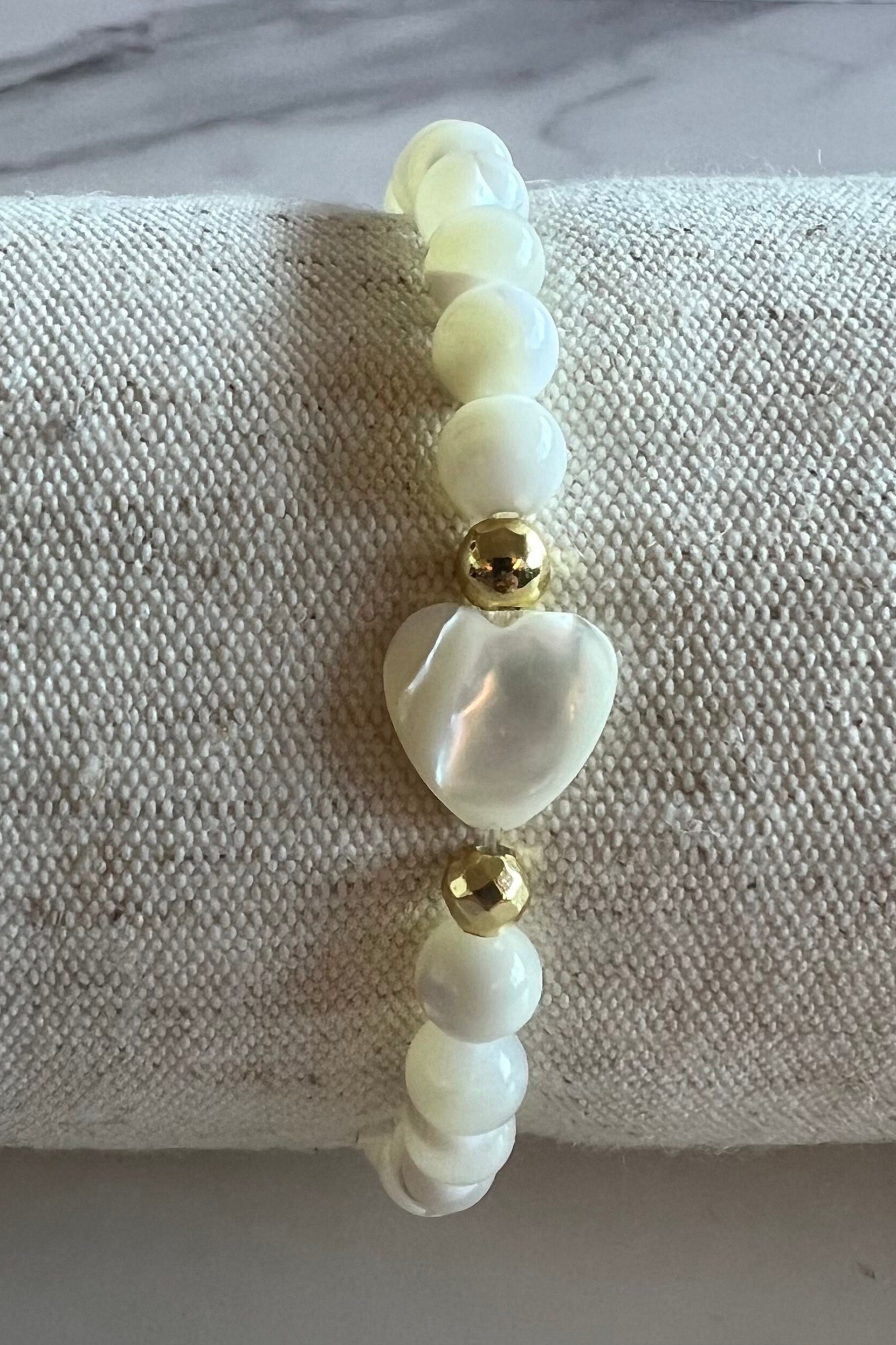 Summer Vibes 6mm Freshwater Mother of Peal Beaded Bracelet with MOP Heart Focal Bead and Gold Hematite Spacer Beads