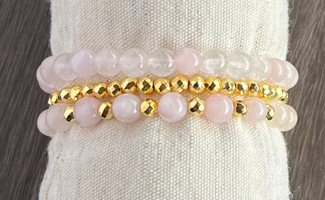 Set of three bracelets: Rose Quartz Love 6mm beads, Gold Hematite 4mm beads, Rose Quartz 6mm bead & Gold Hematite 4mm bead mix