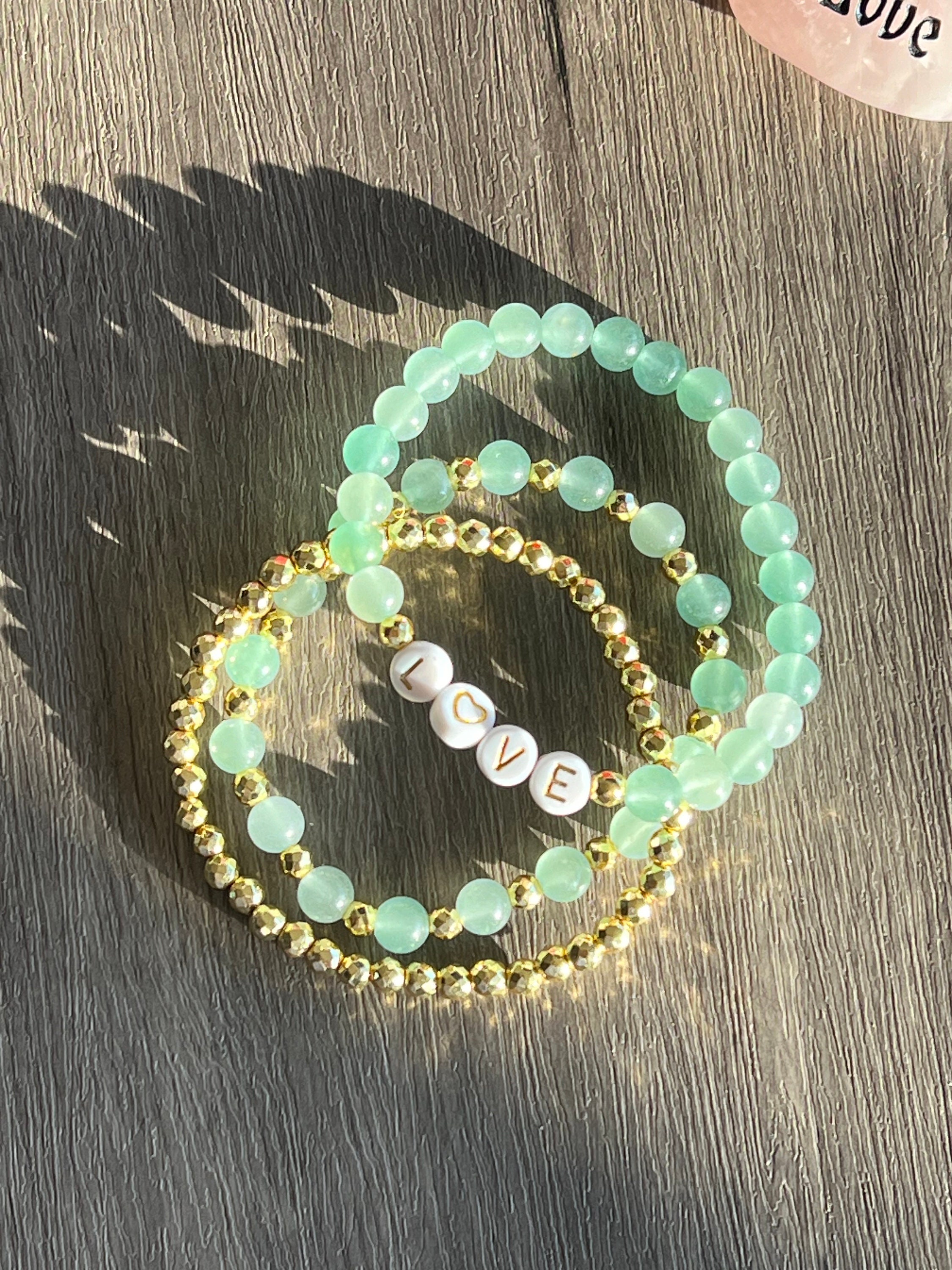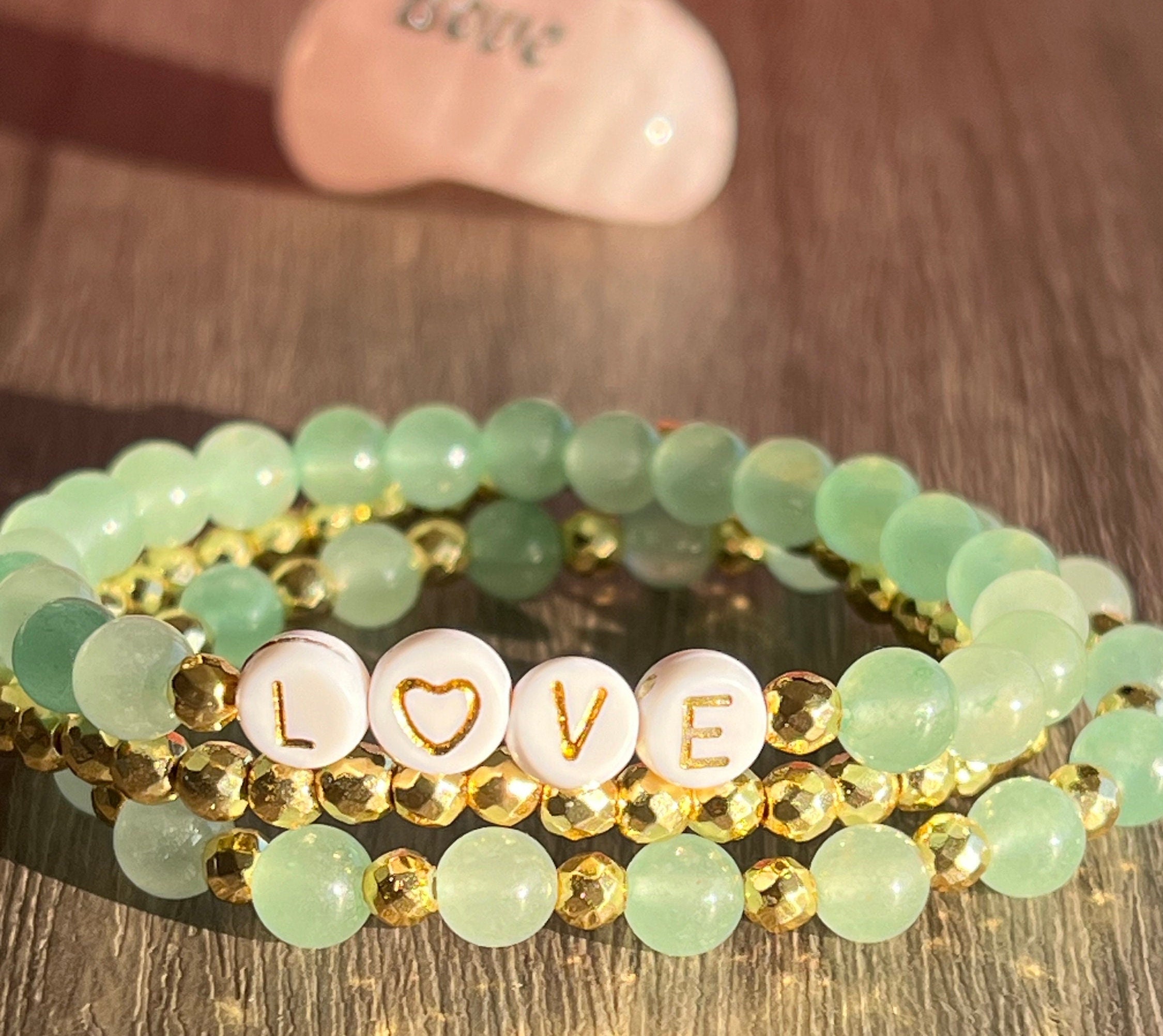 Set of three bracelets: Green Aventurine Love 6mm beads, Gold Hematite 4mm beads, Green Aventurine 6mm bead & Gold Hematite 4mm bead mix