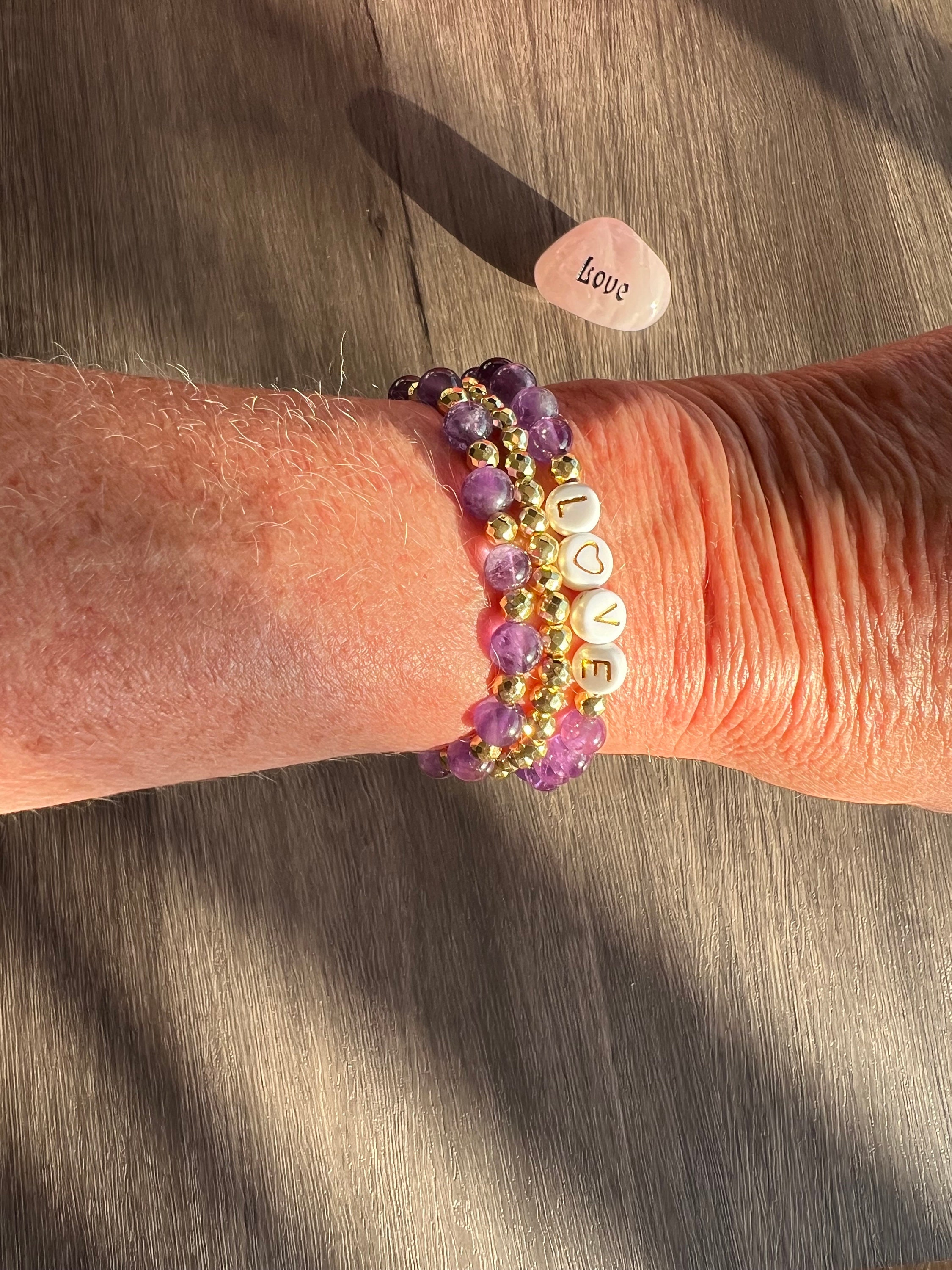 Set of three bracelets: Amethyst Love 6mm beads, Gold Hematite 4mm beads, Amethyst 6mm bead & Gold Hematite 4mm bead mix