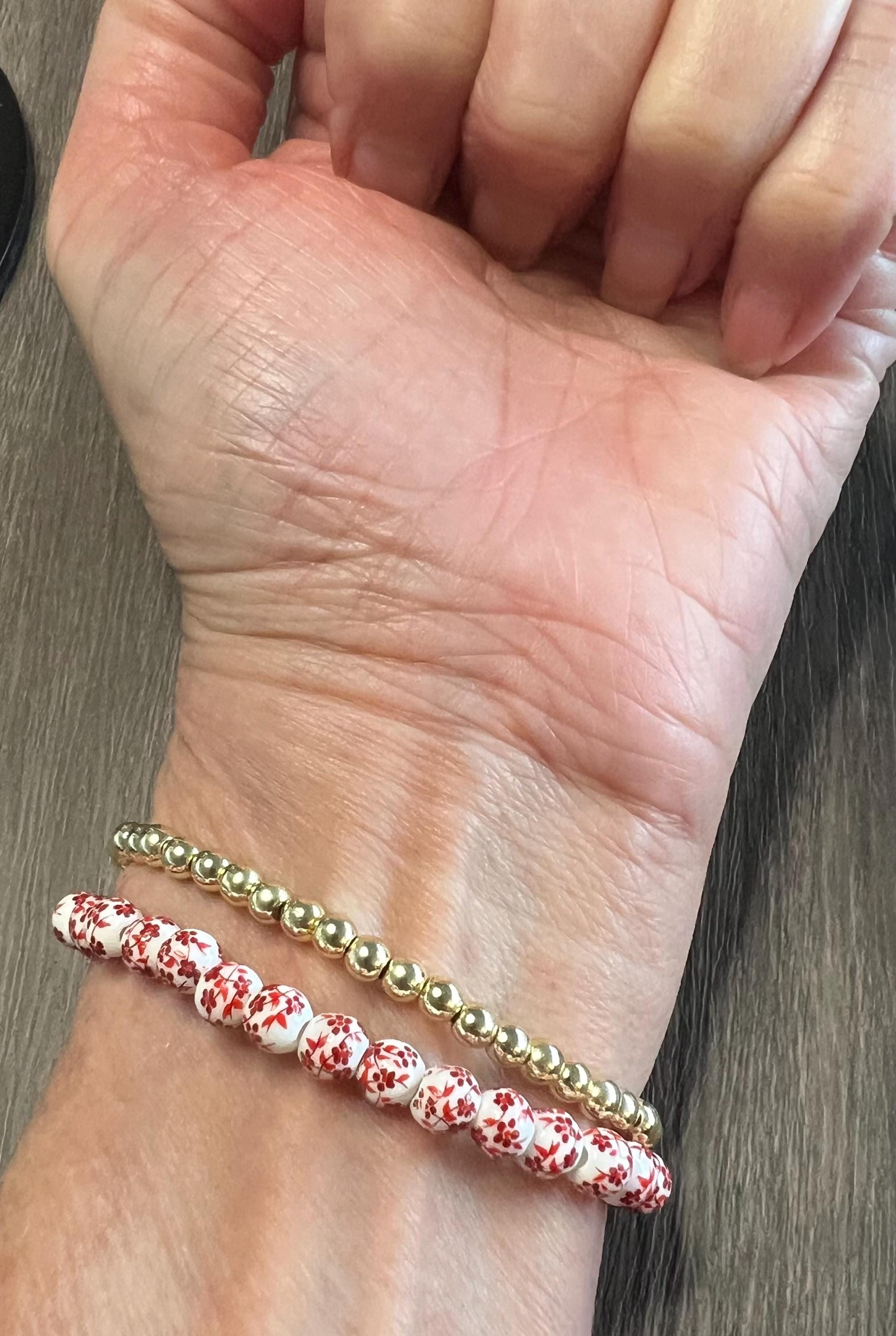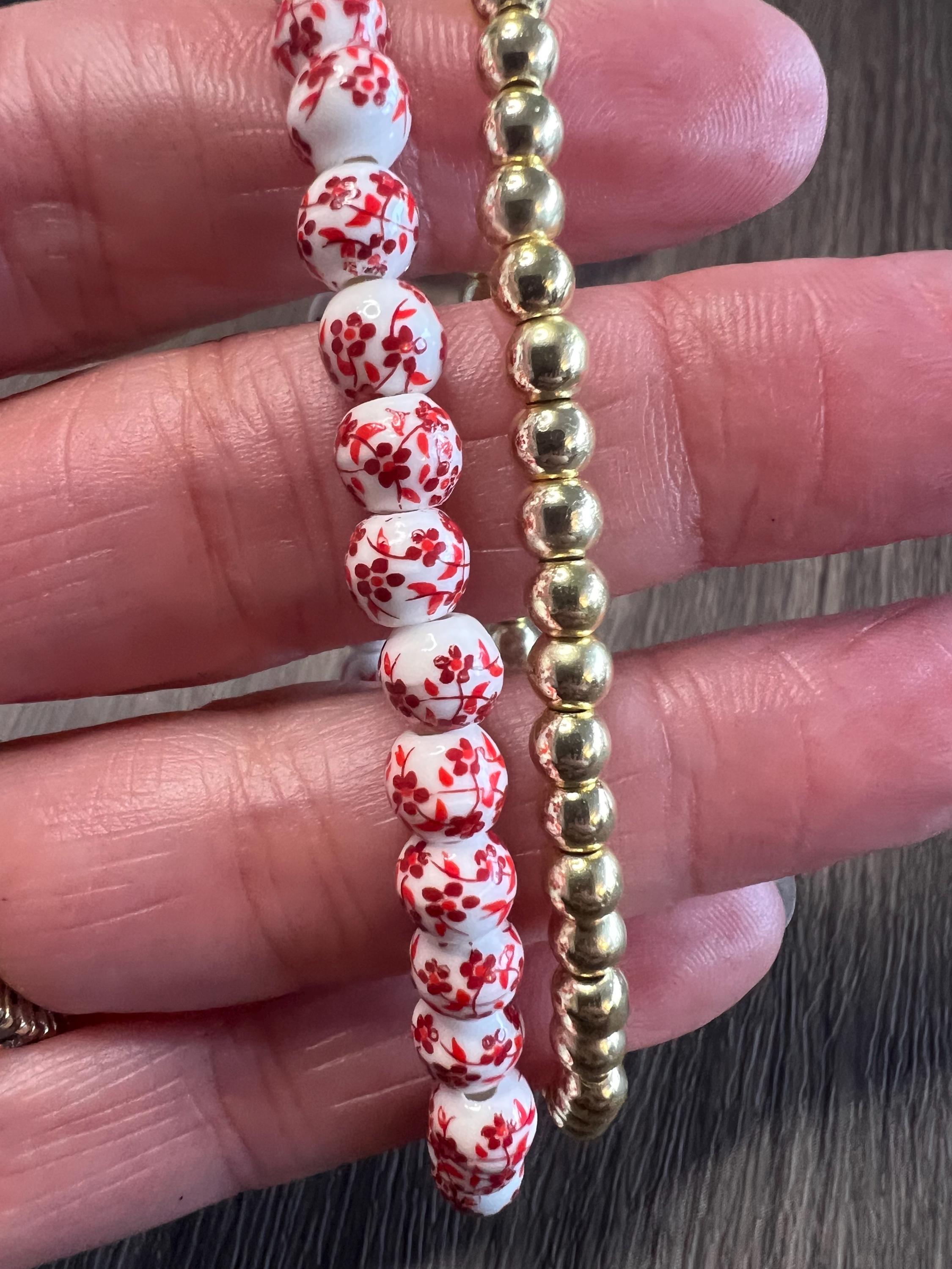 Red floral ceramic beaded bracelet with Gold Hematite additional bracelet
